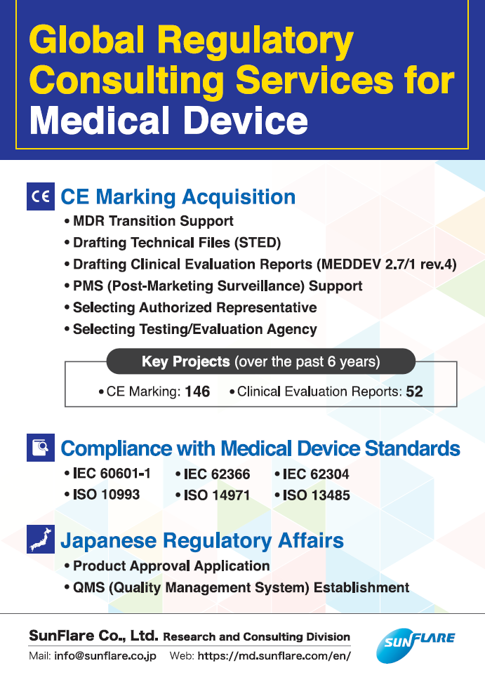 株式会社サン・フレア リサーチ&コンサルティング部門は、医療機器の開発初期段階から事業化に至るまで、薬機法や海外薬事を見据えたワンストップかつグローバルな支援を通して、医療機器関連企業を始めとしたステークホルダーの皆様の医療機器薬事ニーズに応えるべく活動しております。主に、グローバルな戦略・薬事コンサルティング、世界各国における法規制・規格・製品に関する調査、高度な専門性を伴う医療機器翻訳、世界各国における各国規制・ガイドライン参考和訳販売、オンサイトセミナー・講習会、人材育成プログラムなどの企画・実施等のサービスを提供し、医療機器の薬事をトータルでサポートしております。